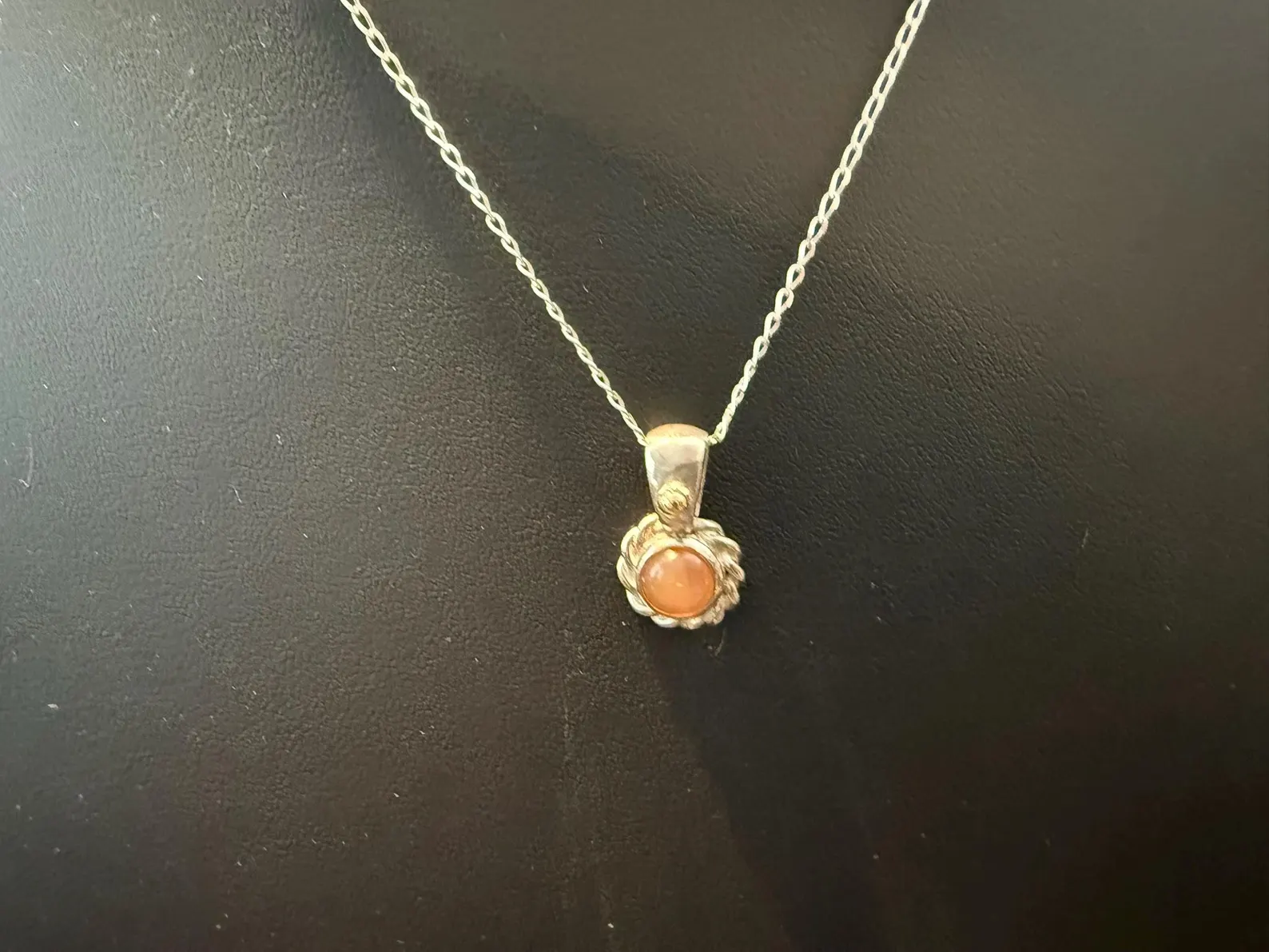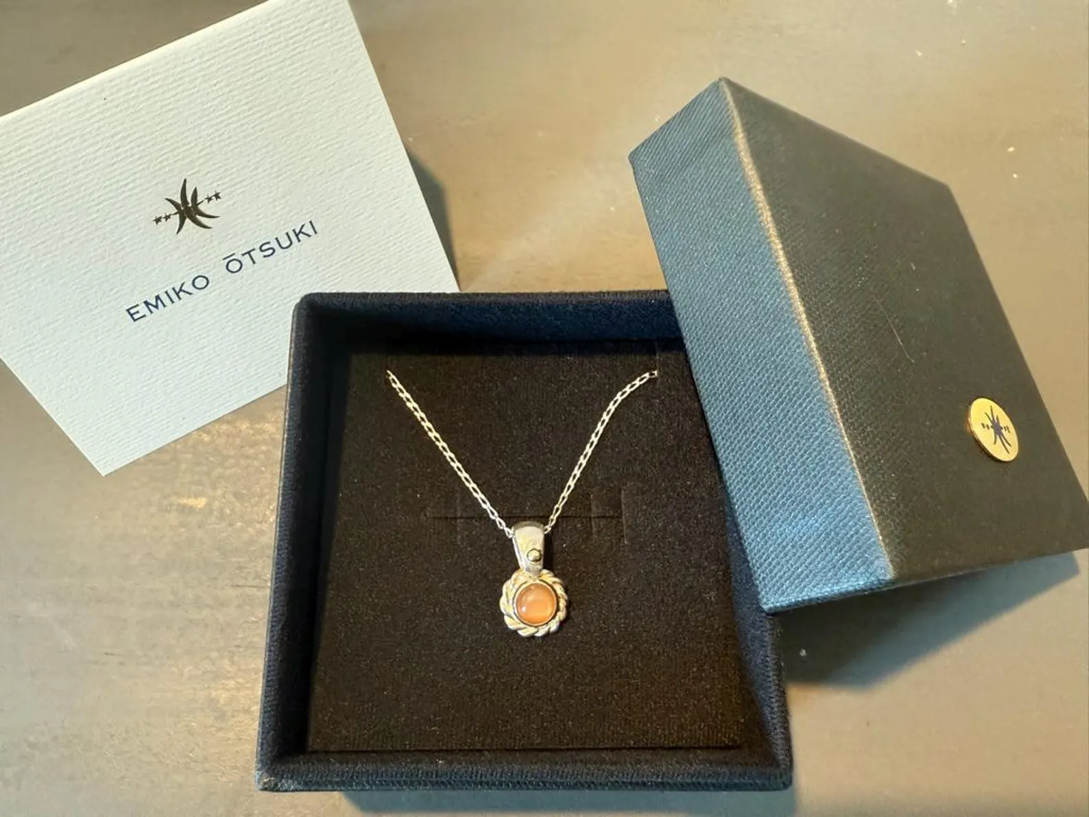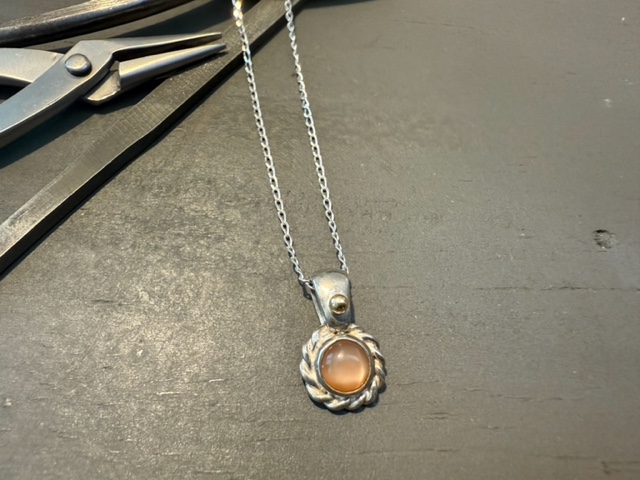 This charming pendant, adorned with a delicate rope pattern and a softly glowing orange moonstone, is accented with a small K18 gold ball at the top.